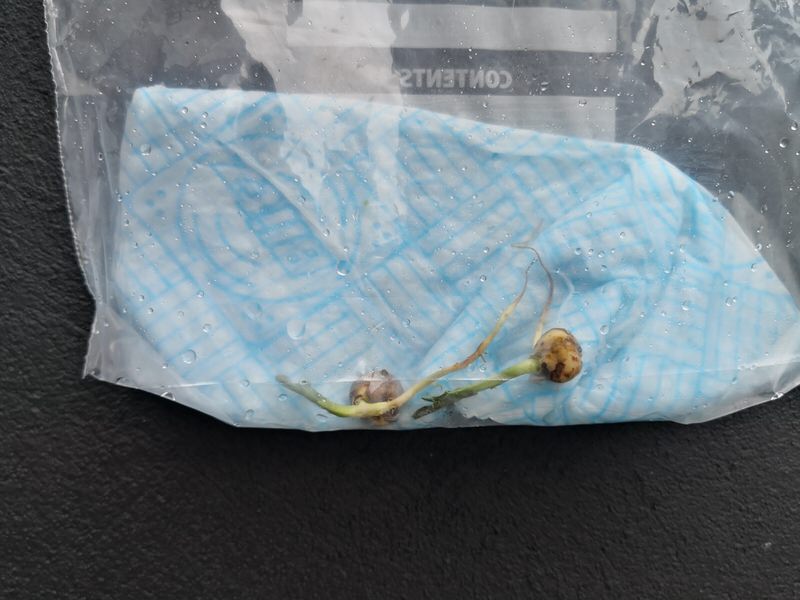 I placed the three peas into the plastic bag, with the wet tissue. When two weeks had passed, I was shocked to find the peas had sprouted!
