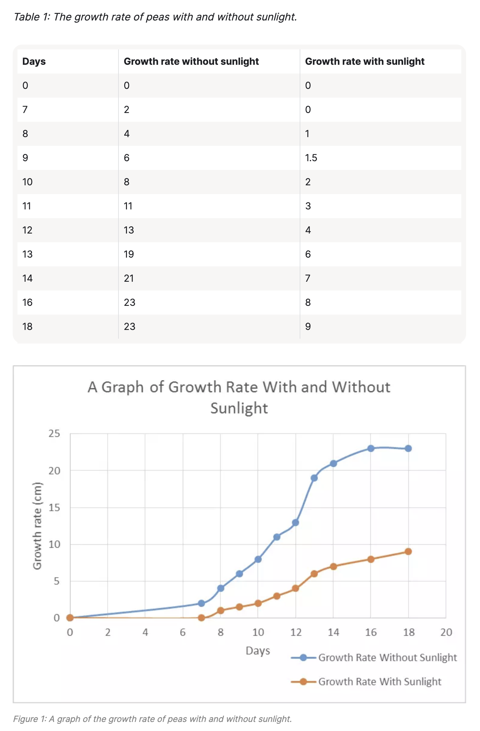 During my Google research I found the table and graph above, it shows an experiment of pea growth with and without sunlight. The results are the same as our findings in our class experiment in that the peas without sunlight did better.