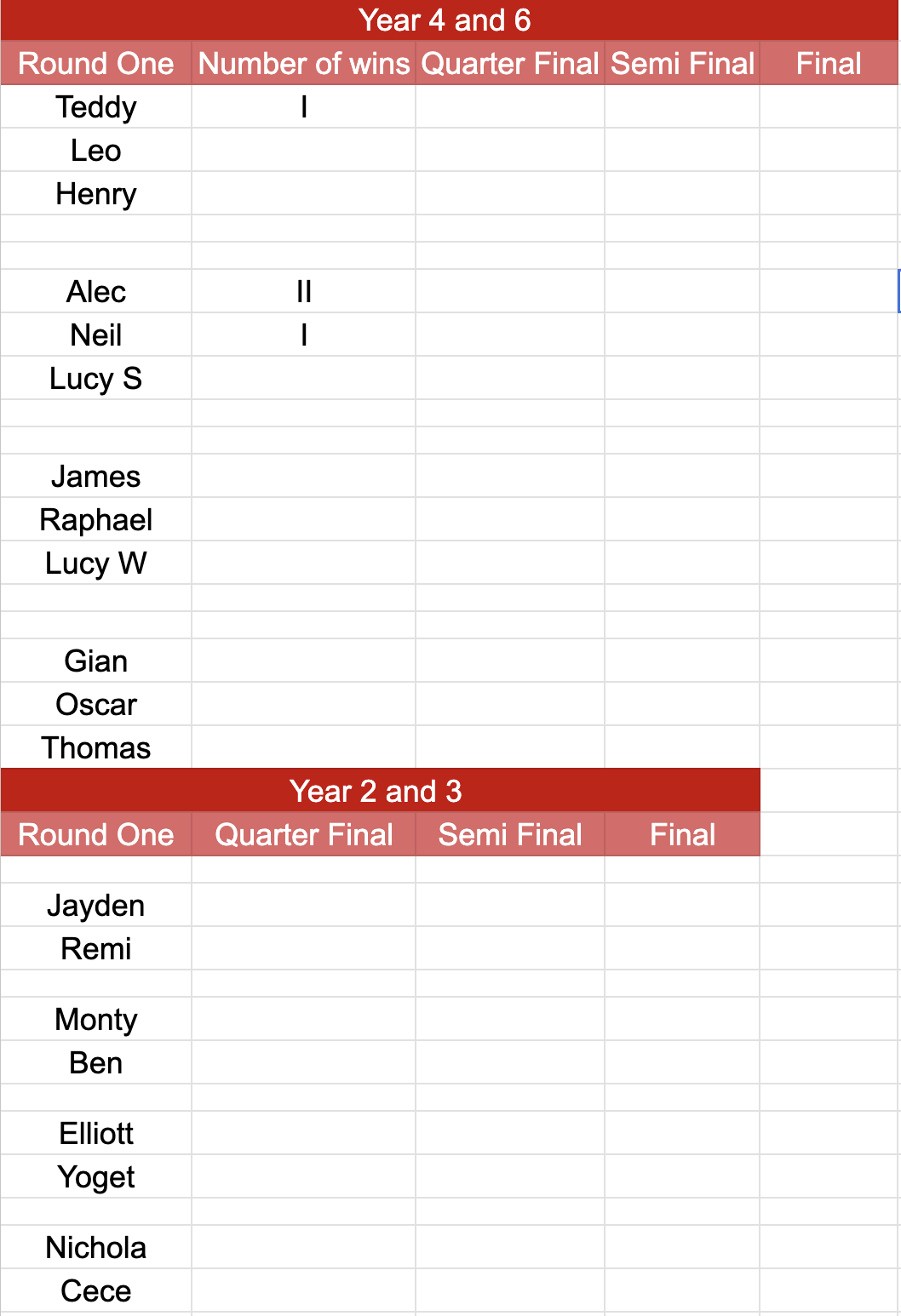 So I have redesigned the tournament to be a knockout style one but also a group stage for year 4 and 6 because there are 12 students in it, which means there wouldn’t be the right number for the final.